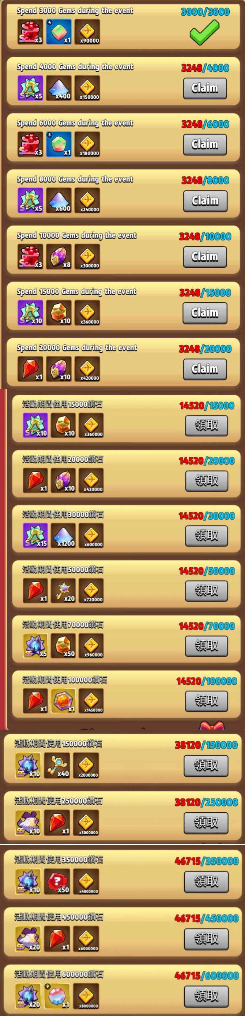 開催中:ラッキーボール、ローラのラッキールーレット、入手限定、消費ギフト(→報酬情報3k~600k)、宝箱リベート(幻彩石・遺物)、ドロップ率アップイベント(ドラゴン)/航海時代