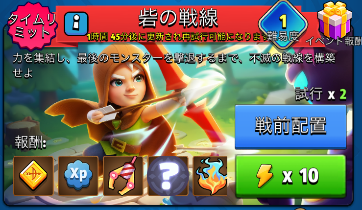 | 回数上限 | 1日2回 (+1回 250ジェム) |