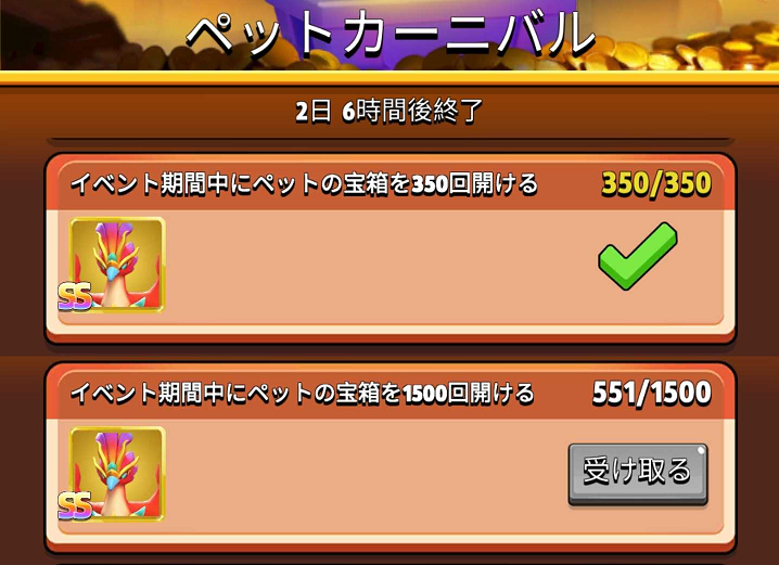 課金勢であれば、1日1つだけ買える金袋1つ100円のパックはかなりお買い得で、報酬にかなりの違いが出るので毎日買っておきたい。最終日になってから5~6袋ほど買い足そうと思うと数倍かかってしまう。