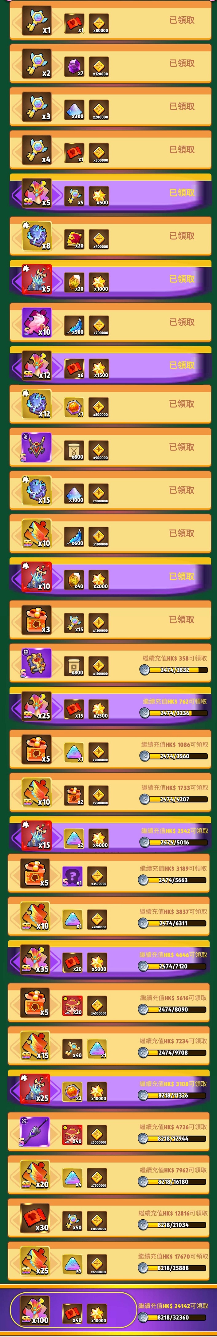 1500ポイント全てを達成するとランダムのS級装備がもらえるのだが、「12000ジェムを入手する」というクエストの無課金での達成には相当なやり込みが必要で、初心者にはまず達成不可能と思われる。これをどうしても取りたい場合は1000円ほどの成長基金を買うのがベストかもしれない。(最終報酬が刀だった時代は無課金でも簡単だったのだが……)