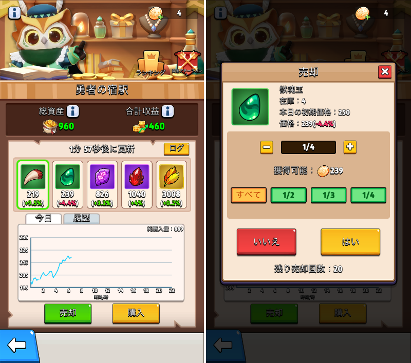 獲得した金貨と宝石はショップで景品と交換できる。豪華な景品は宝石の方に多くなっており、概ね金貨=1ジェム、宝石=4ジェム相当となっているようだ。もっとも、宝石は無課金での入手量では大したものがもらえないので金貨の方が利用価値が高いかもしれない。