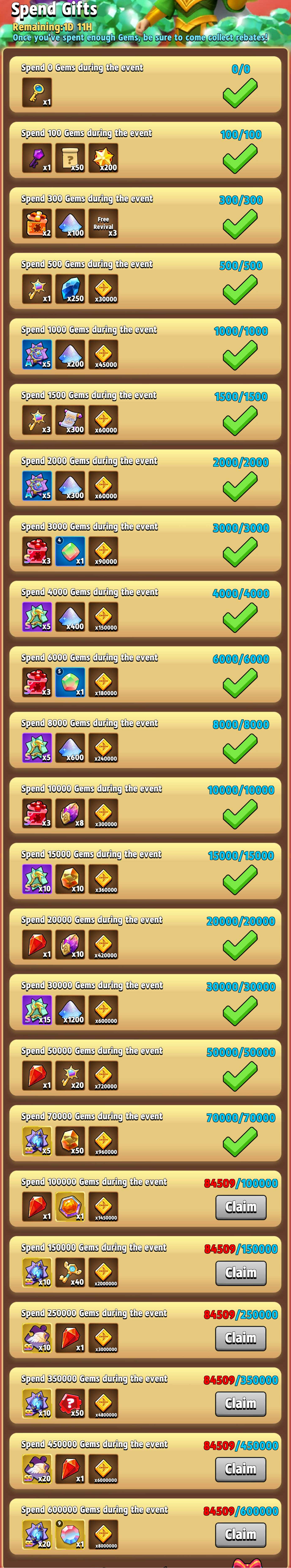 「消費ギフト」(Spend Gifts)は、一定期間中にゲーム内のどこででもジェムを消費することで、ジェムの消費額に応じた景品がもらえる臨時イベント。開催日数は当初はいつも8日間だったが、最近は4~日程度の開催も増えている。